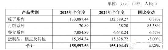 其中粽子系列为营收主力,实现营收13.31亿元,同比微增0.38%,营收占比超八成,月饼系列营收为70.89万元,相较于去年同期的38.20万元,增长85.58%,为主要增长动力,而餐食系列营收为7084.89万元,同比增长6.57%。