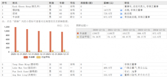 可以看出,牛余新在农产品和食品加工行业有着丰富的经验,但近五年来,他的薪酬却在逐步下降。从2020年到2024年,他的薪酬分别为1200万元、1100万元、1012万元、996万元、972万元,累计降薪228万元。而尽管他的薪酬已经连续多年下降了,但他目前的薪酬在公司高管中仍处于较高水平,仅次于公司总裁穆彦魁。