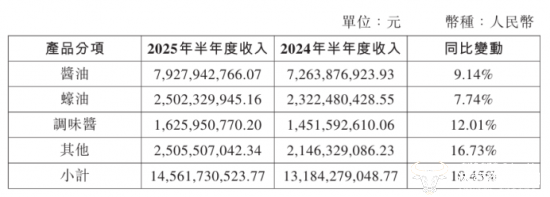 从产品来看,今年上半年,公司主营产品均实现同比增长。其中,海天味业核心产品酱油实现收入79.28亿元,同比增长9.14%,蚝油收入25.02亿元,同比上涨7.74%,而调味酱收入为16.26亿元,同比增加12.01%。