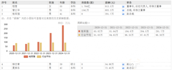 而在去年公司业绩上涨的背景下,公司高管薪酬纷纷增长。桂军强2024年薪酬为291.7万元,相较于2023年的204.5万元,增长了87.2万元,为公司三位副总裁中的最高薪酬。另外两位副总裁柳志青、夏振东2024年薪酬分别为54.86万元、72.45万元,远低于桂军强,这是因为他们是去年9月被聘任为副总裁的,所以并非全年薪酬。