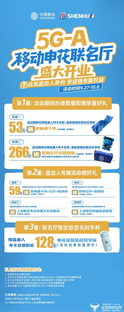 9月27日,中国移动通信集团上海有限公司与上海申花足球俱乐部联合打造的全国首家“5G-A移动申花联名厅”在长宁区盛大开业。即日起至国庆期间,这里将成为广大蓝血人及市民游客的科技运动打卡新热点。