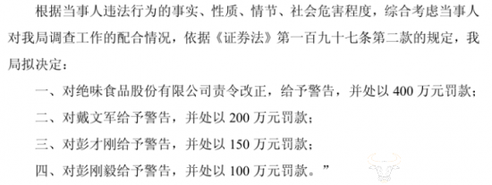 绝味食品被予以警告,罚款400万元,并于9月22日停牌一天,23日复牌后,股票简称由“绝味食品”变更为“ST绝味”。此外,时任董事长兼总经理戴文军、财务总监彭才刚、董事会秘书彭刚毅均被给予警告并分别处以200万、150万和100万元罚款。