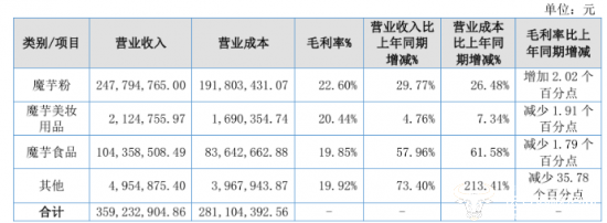 从产品来看,今年上半年,公司三大产品系列均实现同比增长。其中,魔芋粉类食品实现收入2.48亿元,同比增长29.77%,为公司营收主力,魔芋食品收入为1.04亿元,相较于去年同期大幅提升57.96%,魔芋美妆用品则同比增长20.44%至21.24万元。