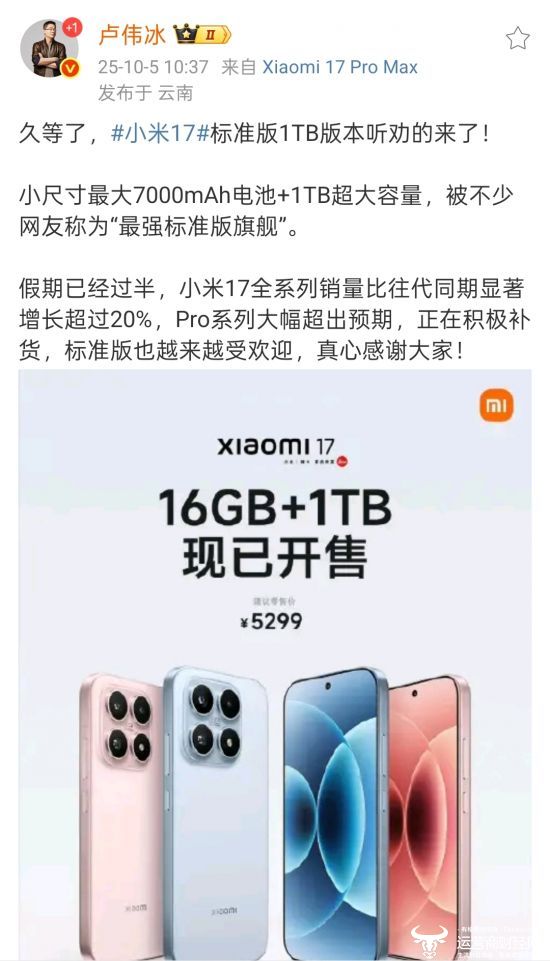 小米集团总裁卢伟冰表示,假期过半,小米17全系列销量比往代同期显著增长超过20%,其中Pro系列大幅超出预期,正在积极补货,标准版也越来越受欢迎。