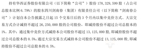 华西证券发布的《关于股东减持计划的预披露公告》显示,公司股东剑南春计划在3个月内减持不超过2625万股公司股份,减持比例不超过总股本的1%,减持方式为集中竞价、大宗交易两种方式。其中,通过集中竞价交易方式减持不超过1312.5万股,通过大宗交易方式减持不超过1312.5万股。
