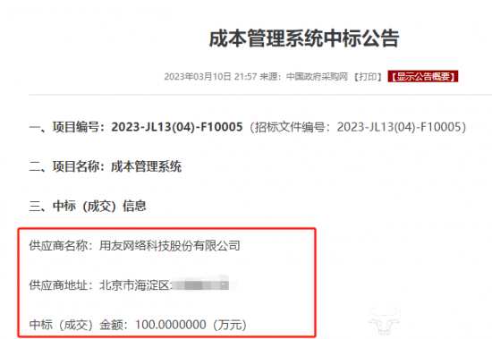 2023年3月10日,中标公告发布,用友以100万元的成交金额中标。