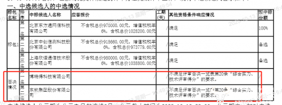 项目同时公示了否决情况:初灵信息子公司博瑞得科技、东软集团因不满足评审否决一览表第20条“综合实力、技术评审得分”的要求,被否决投标。
