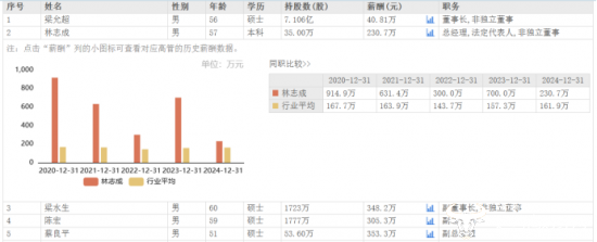 林志成2024年薪酬230.7万元,相较于2023年的700.0万元,下降了469.3万元,是公司高管中降薪最多的,也是他近五年薪酬首次低于300万元,并且低于公司两位副总经理蔡良平和陈宏。蔡良平、陈宏2024年薪酬分别为353.3万元、305.3万元,相较于2023年的500.0万元,分别下降了146.7万元、194.7万元,比林志成分别高了122.6万元、74.6万元。