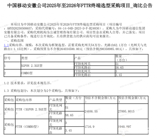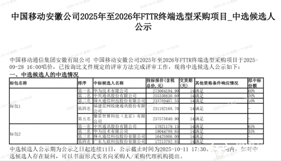 日前,“安徽移动2025年至2026年FTTR终端选型采购项目”中标候选人名单正式出炉,包括华为、中兴和移动某公司在内,多家业内知名厂商都来参与竞标!该项目凭何吸引这些企业前来参投?