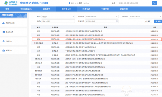天眼查显示,4月7日,中移建设有限公司福建分公司中标龙岩移动“中国移动通信集团福建有限公司龙岩分公司2025年至2027年家庭市场综合支撑服务采购项目”