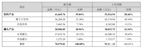 从产品来看,今年上半年,欢乐家饮料产品收入4.17亿,同比下降22.14%,其中核心单品椰子汁饮料收入由去年同期的4.52亿元下降至3.62亿元,但营收占比提升至51.30%。