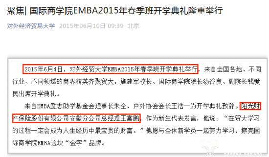 值得一提的是,在对外经贸大学EMBA2015年春季班中,王霄鹏作为新生代表发言过。按理来说,他应该取得了在职研究生学历。但是在阳光保险集团的官网上,王霄鹏的学历依旧为本科学历,不知道是怎么回事?