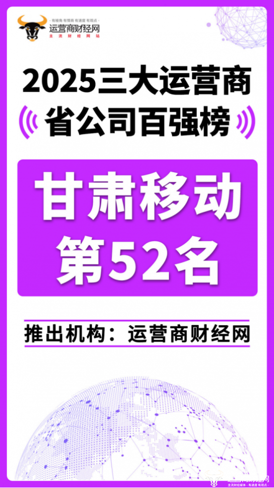 日前,运营商财经网重磅推出“2025三大运营商省公司百强榜”!甘肃移动位列总榜第52名。虽然其规模属于中等型公司,但是在甘肃省内,甘肃移动在甘肃省通信市场占据老大地位。