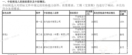 10月10日,中标候选人公示,按照排序第一名至第三名中标候选人分别是华为技术有限公司、亚信科技(中国)有限公司、新华三技术有限公司,三家投标人的交货天数都是30天。