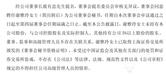 公告显示,谢雅玲女士原为公司证券事务代表,后接任肖传志为公司新任董事会秘书,证券事务代表职位由张凤杰接任。