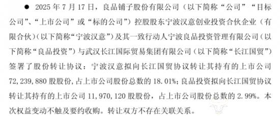 今年7月,长江国贸与良品铺子控股股东宁波汉意以及其一致行动人良品投资,签订了股份转让协议。协议显示,宁波汉意拟向长江国贸协议转让其持有的良品铺子7223.988万股股份,占上市公司股份总数的18.01%,良品投资拟向长江国贸协议转让其持有的良品铺子1197.012万股股份,占上市公司股份总数的2.99%。