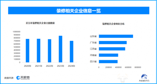 天眼查专业版数据显示,截至目前我国现存在业、存续状态的装修相关企业超682.4万家。其中,2025年截至目前新增注册相关企业约55.8万余家,从企业注册数量趋势来看,近五年间,装修相关企业的注册数量增长平稳,在2023年一度达到顶峰。