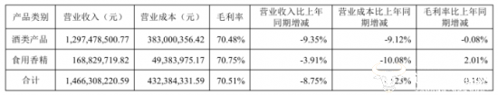 而今年上半年,公司营业收入为14.89亿元,同比下滑8.56%,归母净利润为3.89亿元,同比微降3.32%,营收和利润再次下降。但公司毛利率同比提升0.15个百分点至70.51%,盈利能力还是比较强的。其中,核心业务酒类产品销量1503.27万箱,较去年同期减少约218万箱,收入也同比下滑9.12%至12.97亿元。