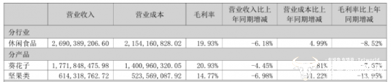 此外,洽洽食品盈利能力也在承压。半年报数据显示,公司今年上半年整体毛利率为20.31%,相较于2024年的28.78%,减少了8.47个百分点,洽洽食品在财报中表示,主要受葵花籽和核心坚果原料成本上升影响。其中,坚果类产品毛利率同比下降13.95个百分点至14.77%,葵花子产品则下降7.67个百分点。