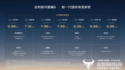 10月30日,新一代国民电混家轿吉利银河星耀6全球上市。新车共推出60km自在版、60km启航版、60km探索版、125km自在版、125km远航版、125km探索+版、125km星舰版7个版型,上市限时指导价为6.88万元-9.98万元。