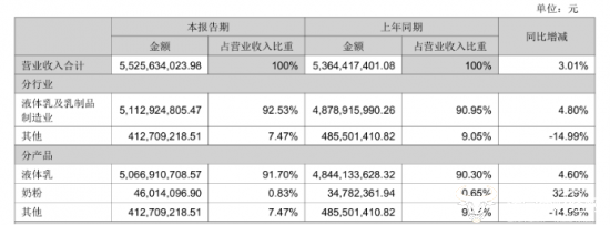 其中核心产品液体乳实现收入50.67亿元,同比增长4.60%,占总营收的91.70%,奶粉实现收入4601.41万元,同比增长32.29%,但仅占总营收的0.83%,对业绩的影响作用有限。