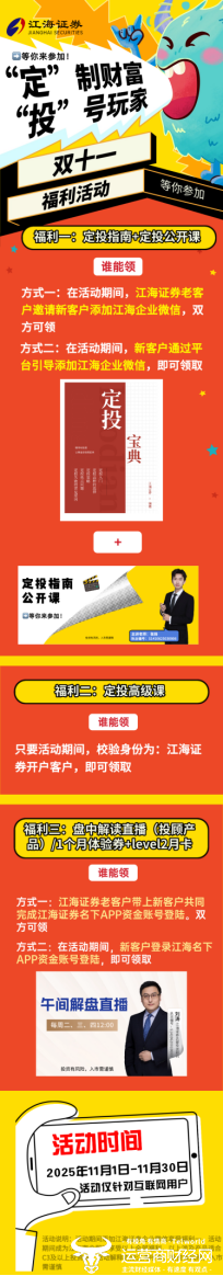11月不只有购物车,更有你的“财富升级计划”!江海证券将于11月1日至11月30日推出以“江海福利大放送”为主题的的系列投教活动,通过提供涵盖“龙头战法训练营”、“‘定’制财富,‘投’号玩家”和“A股集训队”三大板块的体系化投教内容,旨在为不同层次的投资者提供实实在在的投资“装备”。