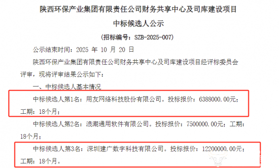 10月20日,中标结果公示,用友网络以638.8万元的价格成功中标,最后是报价最低的中标了。