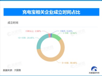 天眼查专业版数据显示,截至目前我国现存在业、存续状态的充电宝相关企业超1.6万家。从区域分布来看,广东省充电宝相关企业数量位居首位。从成立时间来看,59.45%的企业成立于5-10年之间,而成立10-15年的企业占比也已达到了24.45%。