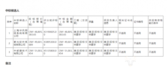 第一中标候选人是上海华讯网络系统有限公司,含税报价为48805383.65元;第二中标候选人是紫光软件系统有限公司,含税报价为49601689元;第三中标候选人是中邮建技术有限公司,含税报价为51003454元。