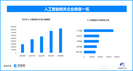 天眼查数据显示,现存人工智能相关企业462.7万余家,2025年1月到现在新增注册相关企业67.9万余家,与2024年同期相比增长48.5%。从地域分布来看,广东、北京、江苏、浙江、山东、湖北拥有人工智能相关企业较多。其中,超5成的企业成立时间在1至5年之间。