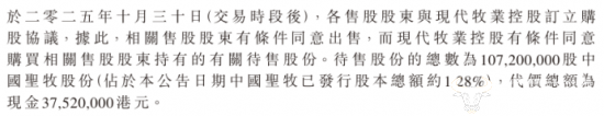 公告显示,现代牧业将以3752万港元收购中国圣牧约1.28%的股权,而这笔收购完成后,将使现代牧业及其一致行动人的持股比例超过30%,从而触发要约收购。也就是说,根据港股规则,持股30%是控股股东与非控股股东的分界,一旦超过30%,须以同等条件向全体股东发起收购。因此现代牧业将以每股0.35港元的价格收购中国圣牧剩余股份,最高交易总价约为20.16亿港元。