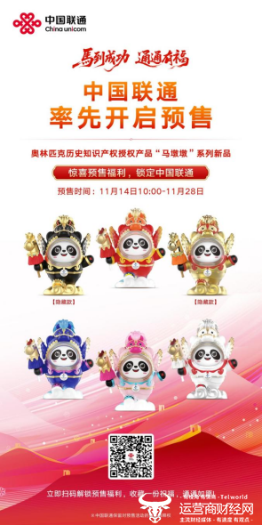 11月14日,墩墩家族新年产品“马墩墩”正式发布!作为“双奥企业”与数字信息基础设施运营服务国家队,中国联通始终将自身发展融入国家大局,坚持以文化自信与数字创新驱动高质量发展。中国联通作为全渠道特许零售商,即日起开启“马墩墩”全渠道预售,为广大爱好者与收藏家提供抢先拥有的官方通道。