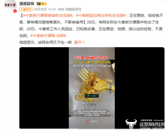 据消费者在社交媒体发布的视频,其在今麦郎方便面中发现黑色异物,疑似为虫卵,后引起网友广泛讨论。随即今麦郎对媒体回应称,“消费者可能没有核实清楚,就认为是虫卵,此前也有消费者反馈存在不同问题的情况,但结果都不是虫卵等异物”。