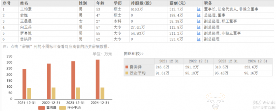 可以看出,雷洪泽已在均瑶集团工作超10年,积累了丰富的经验。雷洪泽2024年薪酬为323.6万元,相较于2023年的310.5万元,上涨了13.1万元,是公司高管中的最高薪酬,比董事长王均豪还高,后者薪酬为312.7万元,也可见雷洪泽的贡献大,为董事长王均豪所看重。