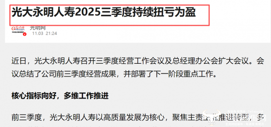 根据网上随便可查到的大量公关稿显示,近日,光大永明人寿召开三季度经营工作会议及总经理办公会扩大会议。会议总结了公司前三季度经营成果,并部署了下一阶段重点工作。其中称,“截至今年9月末,光大永明人寿营业收入同比增长20%左右,连续三个季度实现扭亏为盈”。