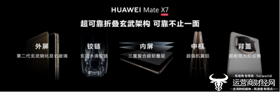 HUAWEI Mate X7机身架构实现革命性突破,搭载超可靠折叠玄武架构,可靠不止一面。第二代玄武钢化昆仑玻璃外屏[ HUAWEI Mate X7典藏版外屏采用第二代玄武钢化昆仑玻璃,其他版本外屏采用第二代昆仑玻璃,请以实际销售版本为准]、玄武水滴铰链、三重复合超韧叠层内屏、超强机翼铝中框、超耐用光织云锦背盖,五大升级协同,构筑超强防护,为用户提供可靠安心体验。折叠屏手机轻薄与可靠实现二者兼得。
