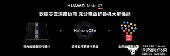 HUAWEI Mate X7以领先的折叠架构设计、流畅的鸿蒙操作系统6和全新鸿蒙生态,充分释放折叠机大屏性能。软硬协同,整机卓越性能提升42%[数据来源于华为实验室,测试机型为 搭载 HarmonyOS 6 出厂版本的 HUAWEI Mate X7 对比搭载 HarmonyOS 4.3 出厂版本的 HUAWEI Mate X6,测试应用均为 2025 年 10 月版本,具体请以实际为准。]。配合3550 m㎡超大VC石墨烯跨轴散热系统,确保高性能持续释放;内置5600mAh大电池,在户外探索模式极限续航配置下可达10天[ 数据来源于华为实验室,实际使用中可能因产品个体差异、使用习惯和环境因素不同而有所不同,请以实际使用情况为准。