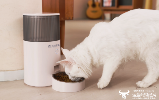 (通过中国移动智能喂食器,宠物能定时定量科学饮食)