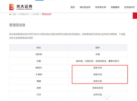 按理,金融机构的高级专家都是享受相应级别待遇的,但并非监管部门正式批准任命的高管,光大证券就靠这些没有通过监管部门正式任命的高级专家分管各个部门?