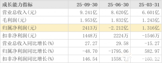 根据2025年发布的财报显示,第一季度总营收为6.601亿元、第二季度总营收为8.620亿元、第三季度总营收为9.241亿元,呈现逐个季度增长的态势。单个季度的归母净利润分别为1.316亿元、-2.212亿元、2413万元,由此可见第二季度显著亏损,第三季度虽有盈利但还不足以覆盖前期亏损。