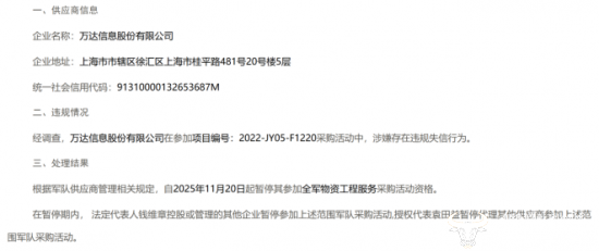 依据相关规定,自2025年11月20日起,万达信息被暂停参与全军物资工程服务采购活动资格;其法定代表人钱维章控股或管理的其他企业、授权代表袁田益代理的其他供应商,也同步被限制参与该范围采购活动,处罚范围覆盖企业及关联主体。