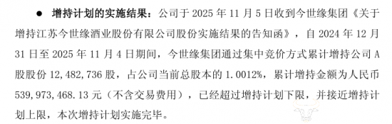 虽然今世缘业绩有所下滑,但公司控股股东却增持了公司股份。据今世缘发布的公告,为“通过增持稳定投资者信心”,自2024年12月31日至2025年11月4日期间,今世缘集团以自有及自筹资金,通过集中竞价方式合计增持公司A股股份12482736股,累计增持金额约为5.40亿元。增持计划实施完毕后,今世缘集团持股比例上升至46.0003%。