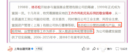 在其他宣传稿中,曾表示林志松以分管的战略与产品、风险控制、运营管理等工作为抓手,深入推进业务和管理创新。而在富国基金曾经发表过的文章称,林志松属于“看家”的中后台人员。不过能确定的是,林志松本身是从合规稽查开始切入职业生涯的。