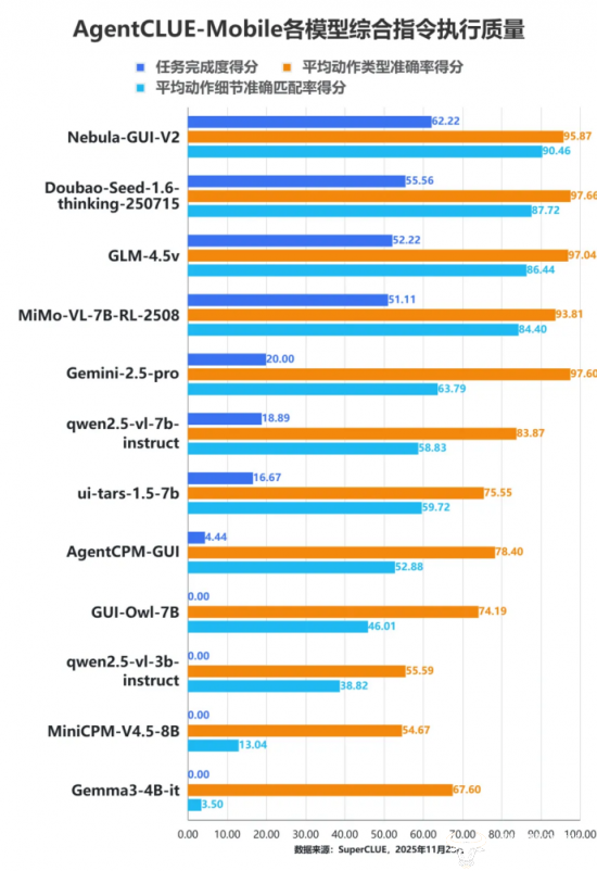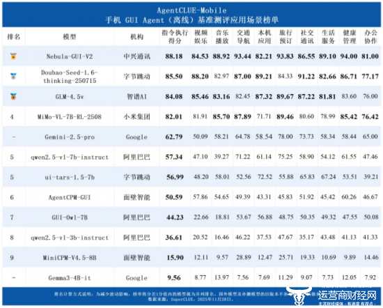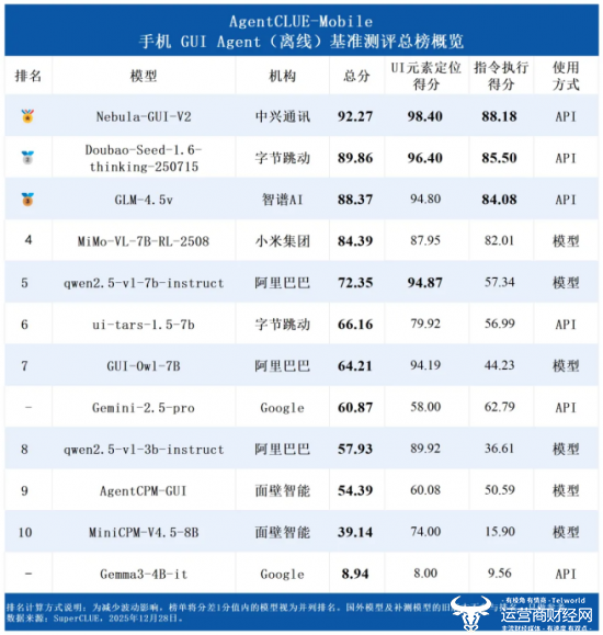 近日,中文语言理解领域权威测评基准SuperCLUE发布第二期手机GUI Agent(离线)测评报告,中兴通讯自主研发的Nebula-GUI-V2凭借92.27的高分强势登顶总榜。Nebul-GUI是中兴通讯星云大模型家族的一员,主要用于各类GUI界面自主操作,在UI元素定位与指令执行两大核心能力上表现突出,以绝对优势领跑行业,彰显了中兴通讯在AI智能交互领域的深厚技术积淀与创新实力。