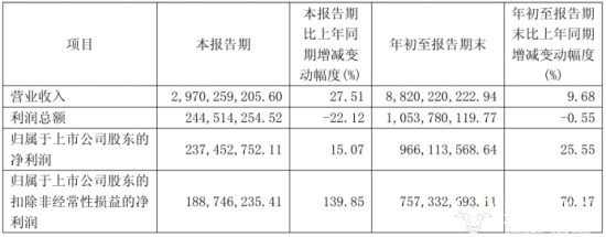 2025年第三季度报告显示,此季度内总营收29.71亿元,同比增长27.51%;归母净利润2.37亿元,同比增长15.07%;扣非净利润1.89亿元,同比增长139.85%。