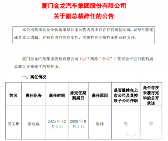 近日,厦门金龙汽车集团股份有限公司发布公告,宣布吴文彬由于退休申请辞去公司副总裁一职,之后将不再担任公司任何职务,这比他的原定任期到期日提前了九个月,引发广泛关注。