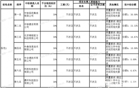 中移系统集成、中移建设、北京锦程前方、网思科技4家企业,均报出39%的最高折扣;中鼎信息、嘉环科技以36%折扣位列第二梯队;中全通技术以35%的最低折扣中标。