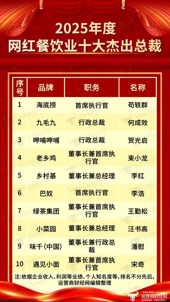 此次推出的“2025年度网红餐饮业十大杰出总裁”均为连锁餐饮品牌,且综合考虑企业多方面的发展情况,包括企业在2025年的营收、利润、翻台率等业绩情况,以及总裁在行业内的名气等诸多因素,保证榜单的客观与公正。