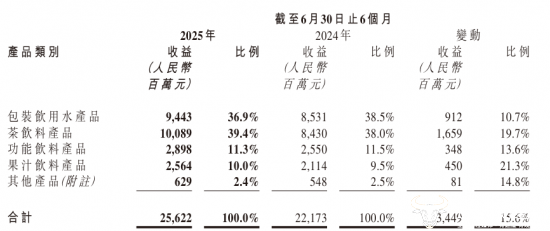 而从产品结构来看,两家企业的核心业务均为茶饮料产品。农夫山泉上半年茶饮料业务收入同比增长19.7%至100.89亿元,首次半年突破百亿元规模,营收占比提升至39.4%。而康师傅以冰红茶为代表的即饮茶产品上半年收入为106.70亿元,同比下降6.3%,营收占比下降至40%。