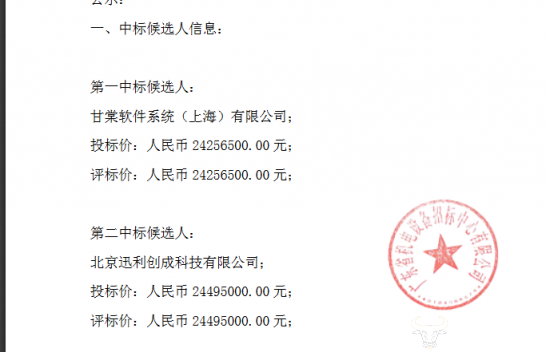 第一中标候选人为甘棠软件系统(上海)有限公司,投标价为2425.65万元;